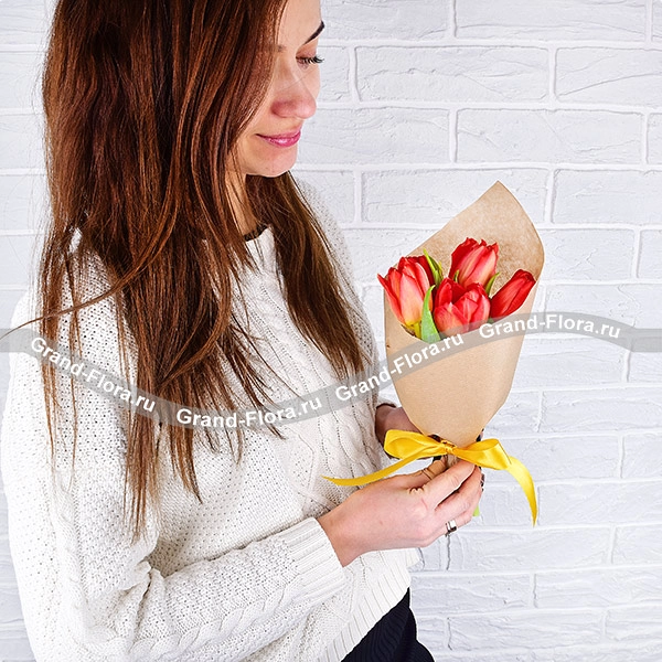 5 тюльпанов: тюльпан красный - 5 шт., упаковка крафт, лента.