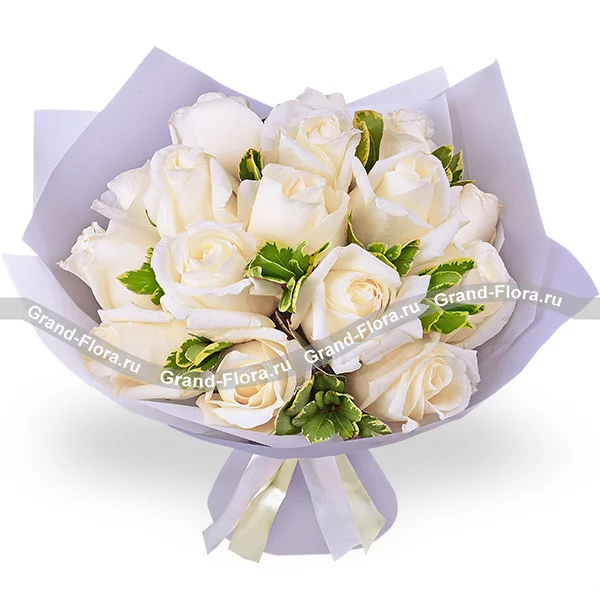 15 роз: роза белая - 15 шт., питтоспорум (возможна замена на фисташку) - 4 шт., упаковка, лента.